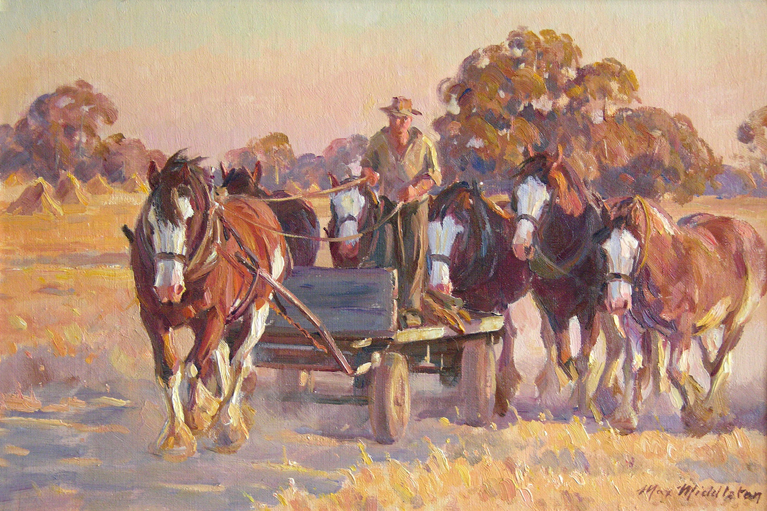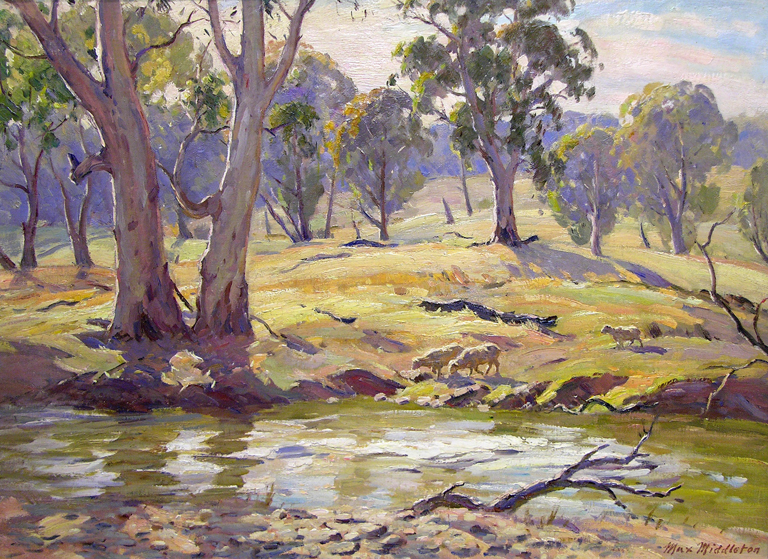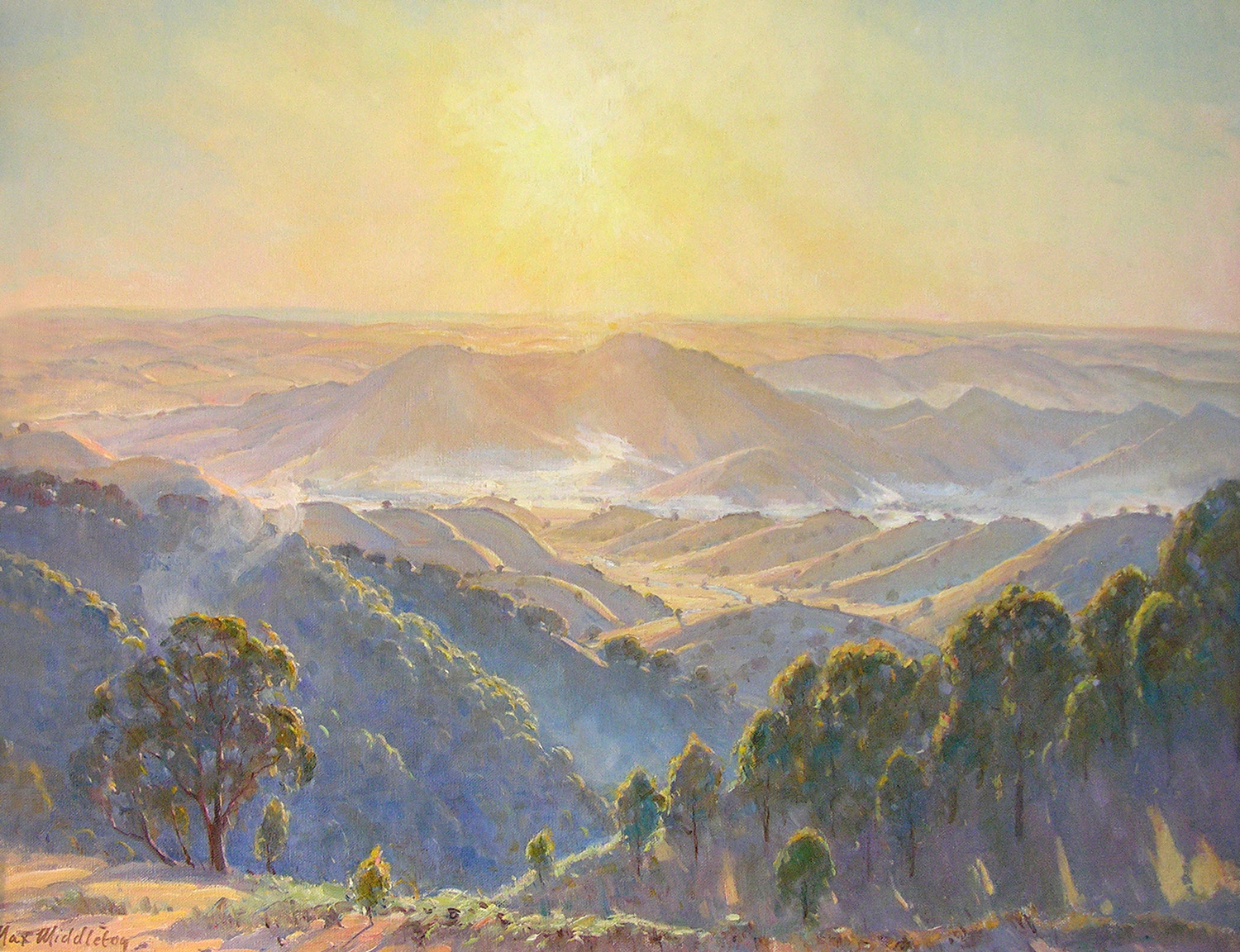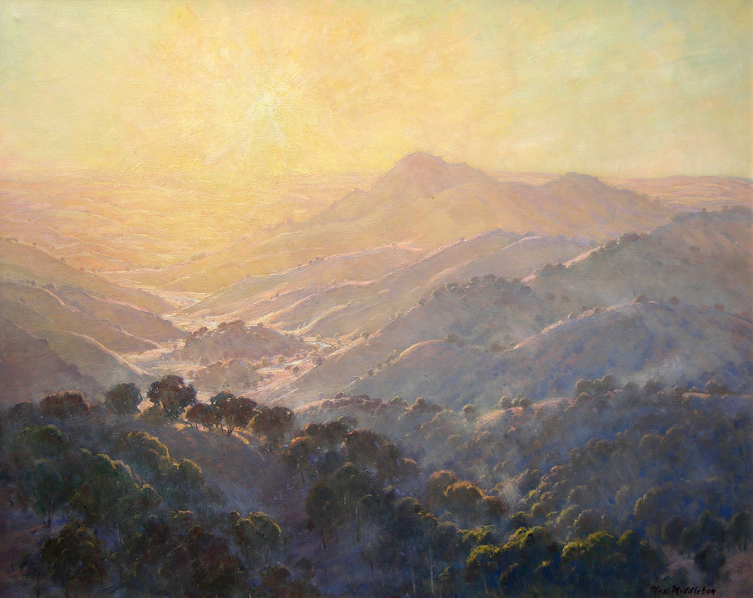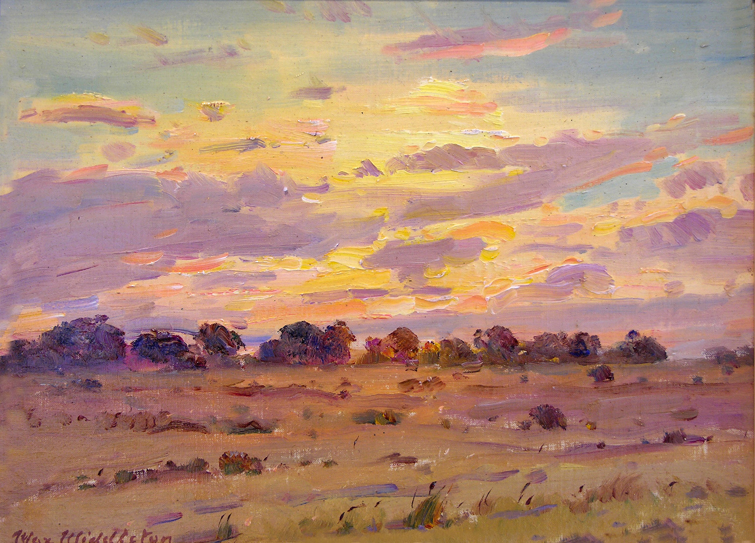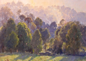 Throughout his career, Max Middleton painted diverse subjects – all of them infused with vitality. Most of Max’s paintings were of the Australian landscape, based upon small oil sketches he painted on location. As an en plein air painter, he faithfully rendered what he saw in lush and juicy oil paint. His profoundly keen observations resulted from the excitement he experienced watching the transforming effect of light on the world. It is light that informs all his work. Often small sketches were painted under extremely difficult circumstances. The harsh realities of 5am starts on frosty autumn mornings in central Victoria, hands stiff and numb with the cold, and eyes strained from hours of staring into the rising sun, never held Max back from doing what he loved most: painting outdoors.