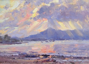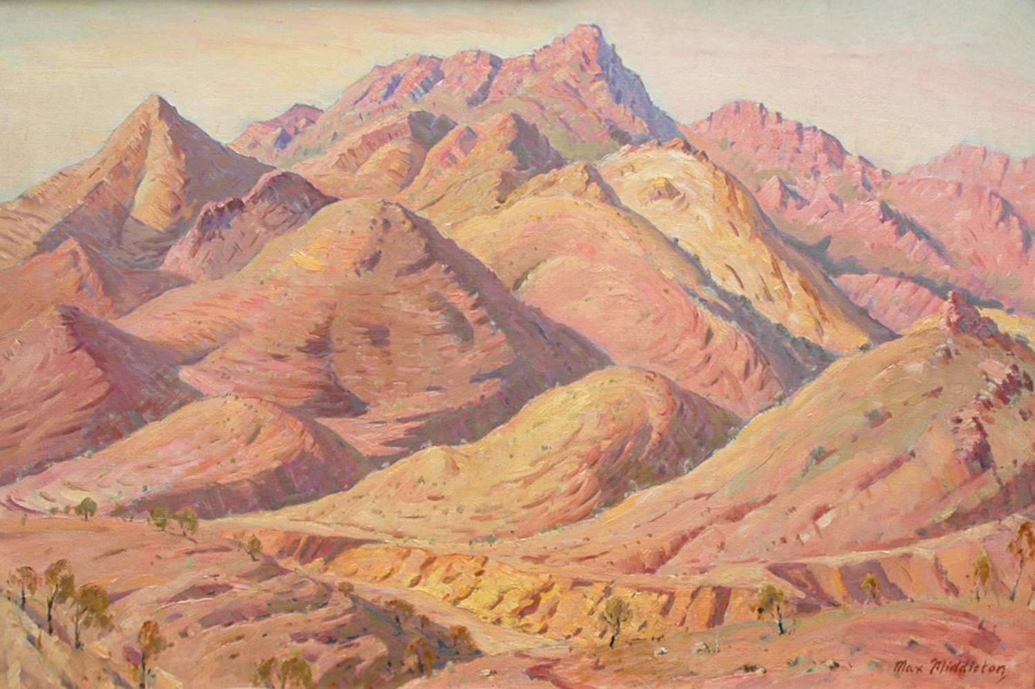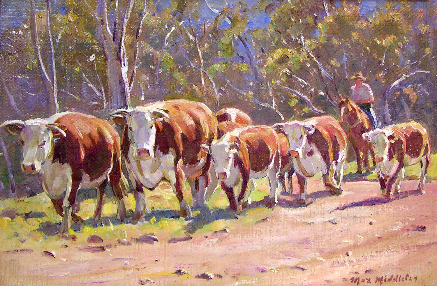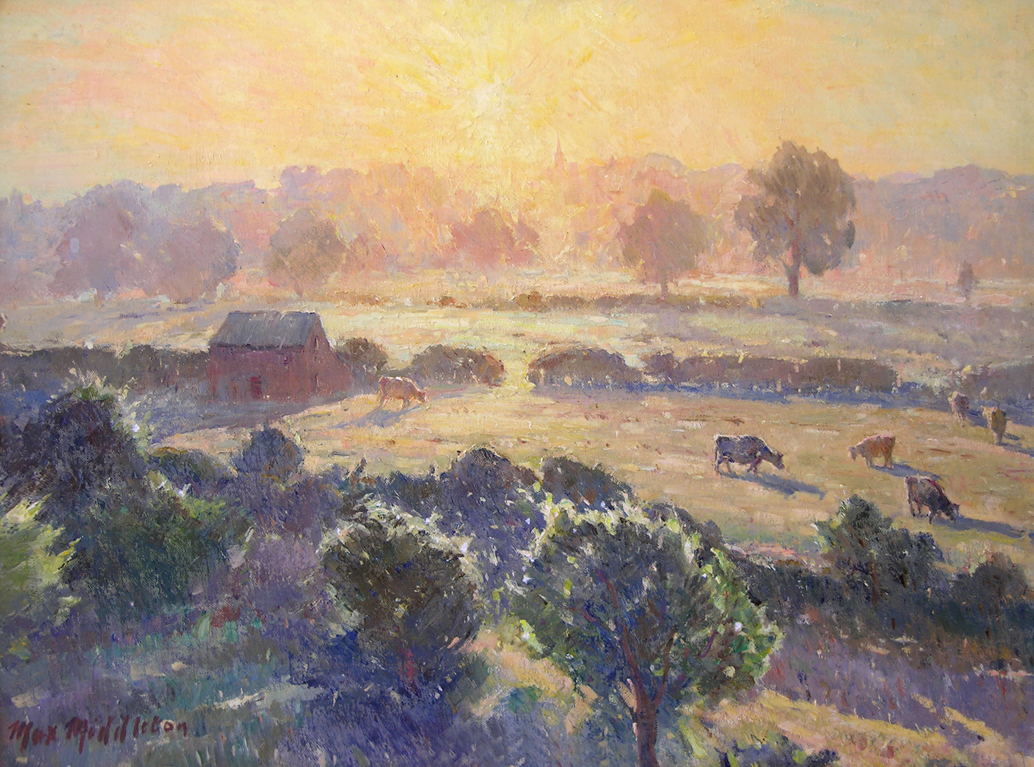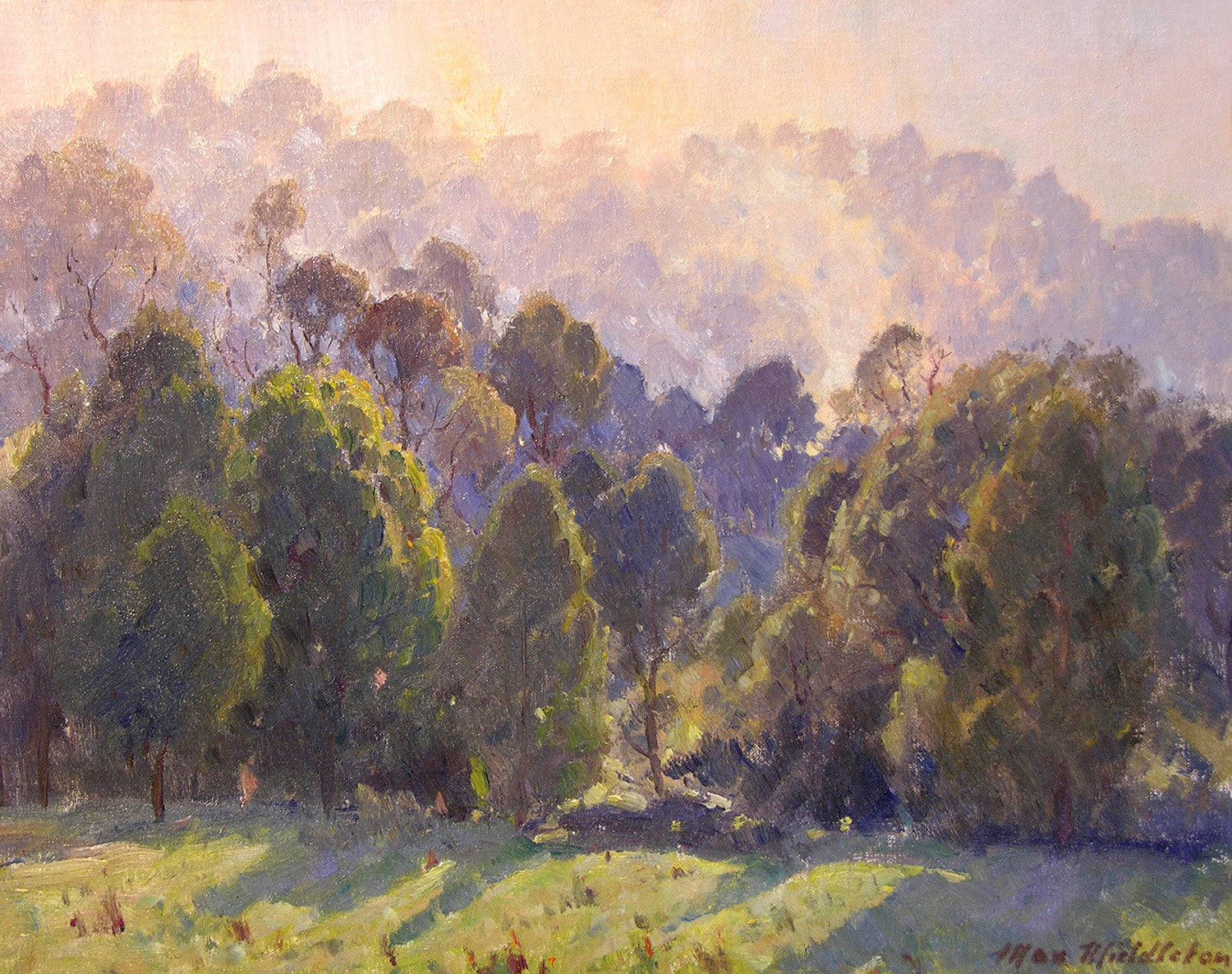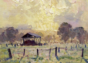 Throughout his career, Max Middleton painted diverse subjects – all of them infused with vitality. Most of Max’s paintings were of the Australian landscape, based upon small oil sketches he painted on location. As an en plein air painter, he faithfully rendered what he saw in lush and juicy oil paint. His profoundly keen observations resulted from the excitement he experienced watching the transforming effect of light on the world. It is light that informs all his work. Often small sketches were painted under extremely difficult circumstances. The harsh realities of 5am starts on frosty autumn mornings in central Victoria, hands stiff and numb with the cold, and eyes strained from hours of staring into the rising sun, never held Max back from doing what he loved most: painting outdoors.