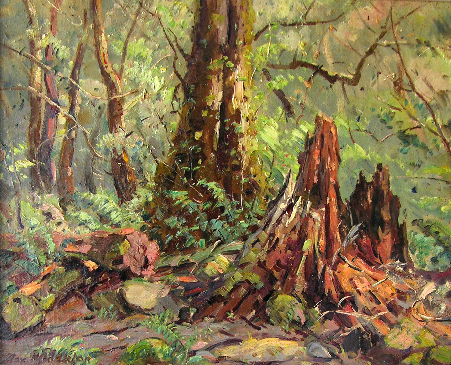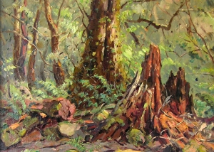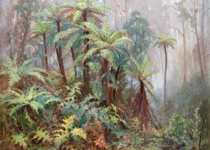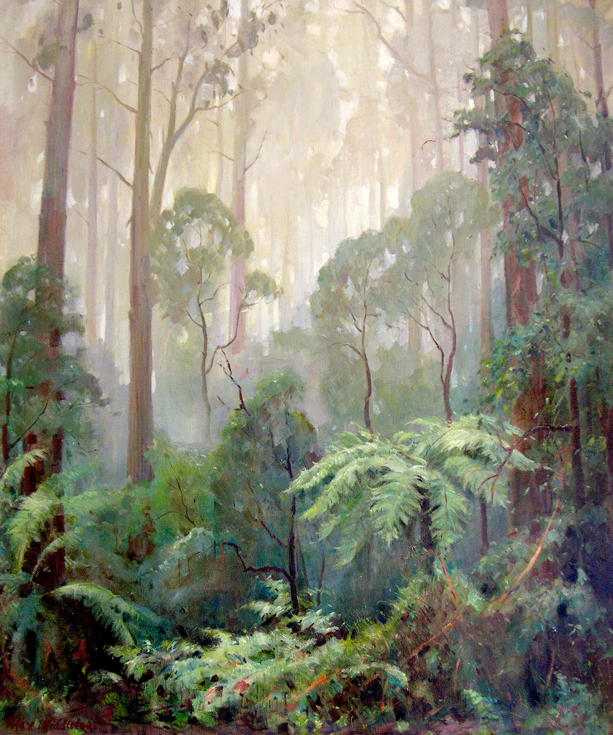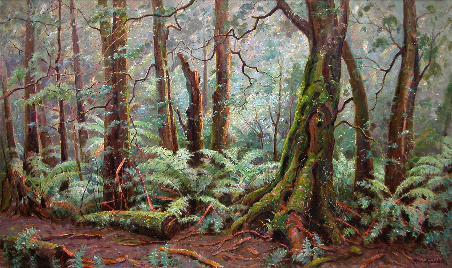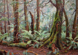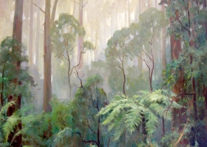Max loved painting Victoria’s rain forests, particularly his beloved Sherbrooke Forest in the Dandenong Ranges where he lived for 28 years. Max regularly trekked into the forest with paints, easel, and a seven-foot umbrella to paint large canvases in wet conditions. He especially relished the forest on cold misty mornings, and was an avid conservationist.